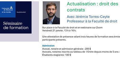 FORMATION THÉORIQUE Durée : 3 heures    Inscrivez-vous dès maintenant! ACTUALISATION : DROIT DES CONTRATS DESCRIPTION SOMMAIRE La formation vise à offrir aux participants un panorama de l’actualité du droit des contrats au cours de l’année écoulée. Il s’agira plus précisément de synthétiser l’actualité légale et jurisprudentielle de la matière afin d’explorer ses conséquences sur les pratiques contractuelles.  Que l’on envisage les questions de la formation, de l’exécution ou de l’extinction du contrat notamment, d’importantes décisions ont été rendues durant la dernière année qui auront une influence sur l’évolution du domaine. ATTESTATION DE FORMATION CONTINUE  Une attestation de présence représentant 3 heures de formation continue sera émise à toute personne ayant rempli le formulaire de présence en ligne lors d’activités offertes en présence en salle et à distance. Un délai de 24 heures vous est accordé pour remplir le formulaire de présence. Une fois le formulaire de présence dûment rempli, l’attestation de présence sera déposée à votre dossier sur la plateforme de formation continue de la Faculté de droit et du CRDP. Veuillez consulter vos notifications à cet effet.  CONFÉRENCIER Jérémie Torres Ceyte , avocat, est professeur à la faculté de droit de l’Université de Montréal. Il enseigne le droit des obligations. Les recherches du professeur Torres-Ceyte sont axées principalement sur le droit des obligations, et notamment ses rapports avec les droits fondamentaux. DÉROULEMENT Vendredi 21 février 2025 Débute à 13 h Sur place à la Faculté de droit, salle multifonctionnelle, A-3421 Sur webinaire Zoom,  inscription obligatoire au webinaire FRAIS D'INSCRIPTION Avocats, notaires et admission générale : 200 $ Membres de l'ordre depuis moins de 5 ans et étudiants stagiaires : 100 $ INFORMATION SUR L'ACTIVITÉ ET SOUTIEN TECHNIQUE Pour toute information sur le déroulement de l’activité ou pour une assistance technique avant l’activité, veuillez contacter le coordonnateur, Pierre Lesage. par : Courriel : pierre.lesage@umontreal.ca Téléphone :  438 354 2160 ASSISTANCE POUR VOTRE INSCRIPTION Pour de l’aide relative à votre inscription, veuillez communiquer avec nous en indiquant le nom complet de l’activité et la date par : Courriel : FormationContinue@droit.umontreal.ca Téléphones : 514 343-2160 et 438 354-2160 * L'horaire du bureau est du lundi au vendredi, de 9 h à 17 h. a named anchor
